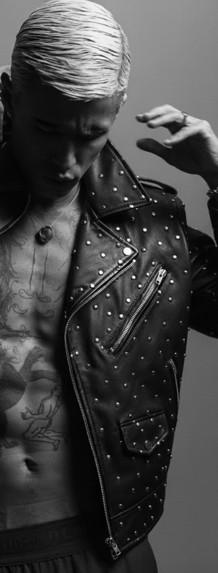 The Starling Studded Jacket is cut in supple black calfskin and armoured with titanium star-studs, a piece that commands attention yet carries intimacy.